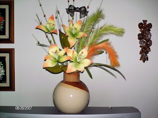 Como fui contactada por uma amiga que tinha dois jarrões em que queria fazer uns arranjos florais e me contactou a pedir uma pequena ajuda, enviei-lhe esta foto de um arranjo floral que tenho no meu corredor como exemplificativo. Espero que ela goste, que lhe sirva como fonte de inspiração e fico à espera que ela me envie as fotos dos seus trabalhos inspirados neste.